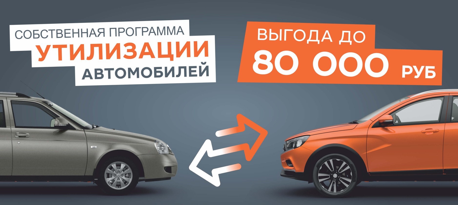 * Предложение действует до 30 апреля 2026 года. В рамках акции, учувствуют новые автомобили LADA. Сдаваемый дилеру автомобиль, должен находиться во владении более 1 года. При этом у автомобиля должны присутствовать основные конструктивные элементы, обеспечивающие передвижение (кузов, двигатель, колеса, органы управления и др.). В дальнейшем сданный автомобиль может быть отправлен на утилизацию в уполномоченную организацию в зависимости от его технического состояния. Выгода по трейд-ин рассчитывается в зависимости от приобретаемого автомобиля. Подробности уточняйте у менеджеров отдела продаж. Не является публичной офертой. Скидки по программам утилизации, трейд-ин не суммируются.