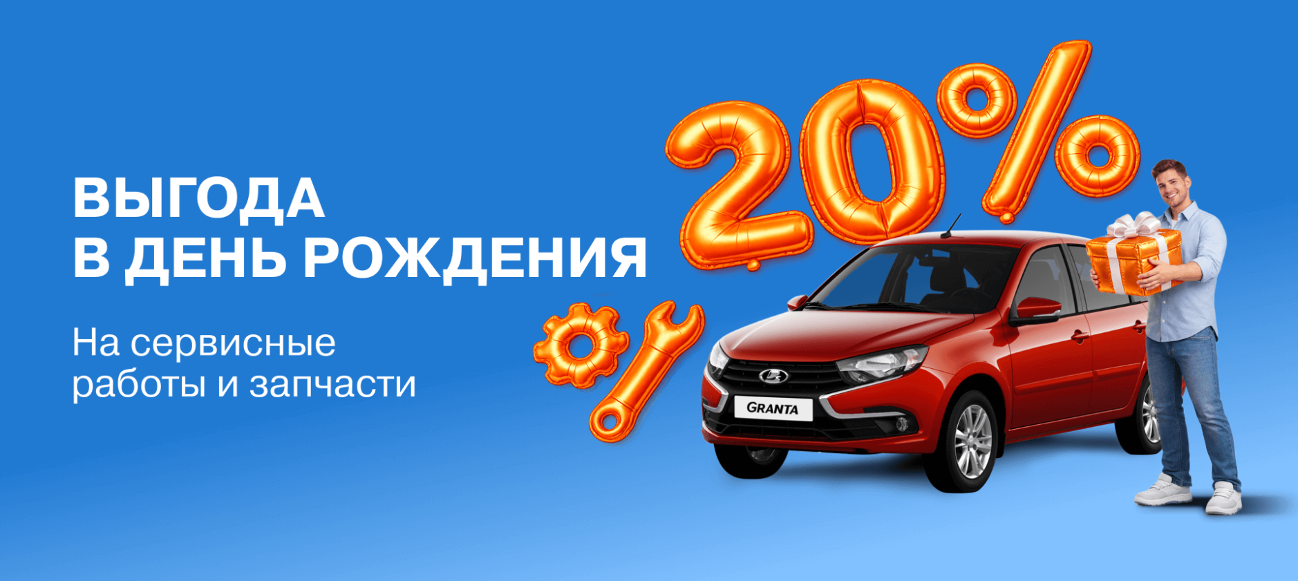 Мы не оставим вас без внимания в день вашего рождения! У нас уже есть готовый подарок - 20% скидка на все виды услуг, предоставляемых нашим сервисным центром. Наша команда экспертов заменит детали, проведет диагностику или заменит масло в вашей LADA.